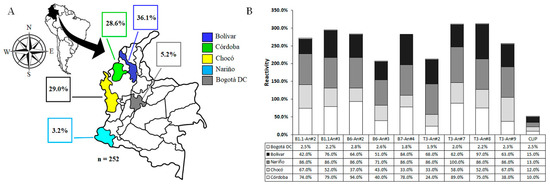 Selected provinces of malaria-endemic and non-endemic areas in Colombia. (A) A total of 252 human sera samples were collected and proportions are shown in agreement with their department (province) of origin. (B) Recognition distribution of selected MSP1 epitope-peptides by human sera antibodies by ELISA tests. CLIP (class-II-associated invariant chain peptide).