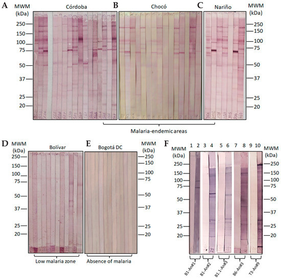 In Colombia, 67.0% of the total cases of malaria come from the Pacific region, with the department of Chocó reporting the most cases of malaria in the country, followed by the Nariño (20.6%) and Córdoba (11.4%) departments. The observed Annual Parasitic Index (API) for 2019 was 10.01 malaria cases per 1000 inhabitants at risk. The Chocó, Nariño, and Córdoba departments (provinces) are zones having high (API) values between 28.4 and 17.2 in the same year, while the Bolivar department displayed a low API while Bogotá DC does not have an API value. This means that the selected areas for this study are considered the zones of the country with historical endemicity, given the high prevalence of parasite-caused infections [25]. Based on the above, four malaria-endemic areas in Colombia were selected for collecting human sera samples (Figure 4A). Western blot analyses that aimed to asses human antibody reactivity were conducted with Plasmodium falciparum 3D7 strain, and showed that 100% of samples from human volunteers from Tumaco (Nariño department), 2% of samples from San Juan de Nepomuceno (Bolívar), 87% from Quibdó (Chocó), and 79% from Tierralta (Córdoba) strongly recognize those characteristic MSP1 protein bands of an SDS-PAGE resolved surface protein lysate while no recognition was shown by human sera samples from Bogotá DC, as expected. Western blot analysis regarding surface protein lysates from the P. falciparum FCB-2 revealed a similar pattern as above with strong reactivities for 75% of samples from human volunteers from Tumaco (Nariño), 8% of samples from San Juan de Nepomuceno (Bolívar), 75% from Quibdó (Chocó), and 78% from Tierralta (Córdoba), and no recognition bands of sera samples from Bogota DC were detected.