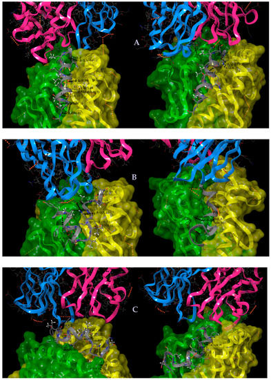 The molecular coupling study was carried out under the ZDock online platform, under an academic license (ZDock Server: references (Umassmed.edu (accessed on 15 August 2022)). Files obtained in the preparation steps and after molecular dynamics were directly loaded on the platform in three stages. Initially, the file corresponding to the receptor is loaded, and subsequently the file corresponding to the peptide (whether native or its modified analogs) is loaded, and finally a third file “.txt” is loaded where the active or involved residues are indicated in the molecular recognition receptor peptide, to indicate to the docking algorithm which amino acids are involved in possible binding from both the receptor and the peptide, simplifying the processing time. At the end of the time required for the docking, a file is generated and downloaded and represents the 1000 best structures for possible dockings, where the shape and orientation of the peptide in the cleft or active sites of the receptor may vary. This file is used as input for a structure refinement program, Fiberdock version 3.0 (Fiberdock Home, Tau.ac.il), which refines the peptide adjustment in the HLA-binding active pockets through movement and guidance of the side chains and flexibility the peptide backbone, taking as reference the 1000 models proposed by the ZDock algorithm.