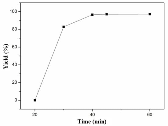 According to our published results [], PNVF-co-PAN was constructed through the aqueous solution polymerization of NVF and AN with a molar ratio of 1:1 using dihydrochloride (AIBA) initiation at 50 °C for 5 h. The molar ratio (1:1) and a mass fraction (0.15) of monomers were employed in the SCCO2 synthetic strategy of polyamidine, and other copolymerization parameters, such as reaction temperature (60 °C), reaction pressure (15 MPa), and initiator dosage (AIVN, 0.015 g), were chosen to explore the effect of reaction time on the yield. As illustrated in Figure 1, no product appeared in at the initial 20 min, but a yield of 85% was obtained at 30 min. The yield increased slightly from 95% to 97% with the increase in reaction time from 40 min to 60 min. The results reveal that the reaction was basically completed in this system after 40 min. In comparison with copolymerization in water, the reaction time of copolymerization in SCCO2 was decreased considerably due to the excellent mass transfer capability of SCCO2. To ensure that copolymerization in SCCO2 was complete, 1 h was chosen as the specified reaction time for the following experiment.