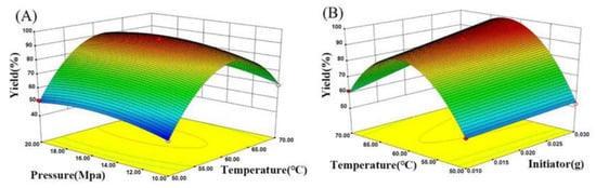 (A) Response surface on yield versus temperature and pressure; (B) response surface on yield versus temperature and initiator.