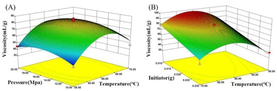 (A) Response surface on viscosity versus temperature and pressure; (B) response surface on viscosity versus temperature and initiator.