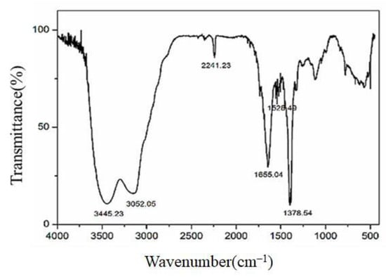 From the ANOVA data, it is clear that the effect of initiator dosage on viscosity is significant by virtue of the p-value of initiator dosage (0.0002). The increase in initiator dosage will decrease viscosity from 93.8 mL/g to 65 mL/g. The p-value of temperature was 0.0219, revealing that temperature was also a significant parameter. The viscosity increased from 52 mL/g to 85 mL/g with a rise in temperature. The p-value of pressure was 0.4749, which was greater than 0.05, indicating that pressure was an insignificant parameter. Considering the trend of yield and viscosity, the experimental parameters (temperature: 61.27 °C; pressure: 15.52 MPa, initiator dosage: 0.02 g) were adopted, and the best yield of 89% and maximum viscosity of 93.4 mL/g were obtained as the optimal conditions. FT-IR was used to characterize the functional groups on PNVF-co-PAN. As displayed in Figure 4, the stretching vibrations of cyano groups were located at 2241 cm−1, and the stretching vibrations of C=O bonds occurred at 1655 cm−1. The peak at 1378 cm−1 was assigned to the -C-N- stretching vibrations. The above results demonstrate that cyano groups and formamide groups existed in the PNVF-co-PAN backbone.