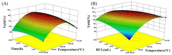 (A) Response surface for yield versus temperature and time; (B) response surface for yield versus temperature and dose of hydrochloric acid.