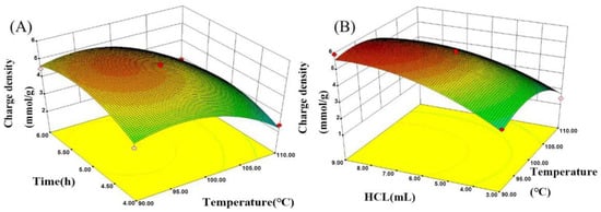 (A) Response surface on charge density versus temperature and time; (B) response surface on charge density versus temperature and dose of hydrochloric acid.