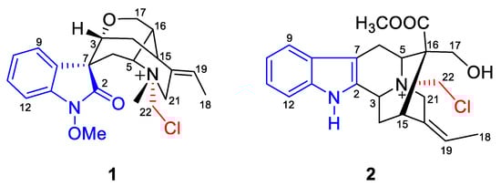 Compound 1 displayed a positive reaction to Dragendorff’s reagent. Based on its HR-ESI-MS spectra, the quasi-molecular ion peak at m/z 403.1785 [M]+ (calcd for C22H28N2O3Cl+ 403.1783) assigned the molecular formula as C22H28N2O3Cl. The 13C and 1H NMR spectroscopic data of compound 1 (Table 1) displayed 22 carbon resonances for humantenine-type alkaloids, including three methyl groups (δC 13.4, 48.6, and 64.3), four methylenes (δC 27.8, 29.4, 65.6, and 54.7), nine methines (δC 33.1, 34.5, 71.0, 74.1, 108.7, 124.8, 126.8, 130.0, and 130.8), and five quaternary carbons (δC 57.0, 130.0, 131.2, 139.5, and 174.9). The above spectroscopic data were similar to those of the compound humantenine [16], except for the remaining CH2 (δC 69.4) and chlorine groups. Furthermore, the HMBC correlations (Figure 2) from δH 3.27 (N4 -CH3) and δH 4.40 (H-21) to δC 69.4 supported the linkage between the remaining -CH2Cl unit and N4.
