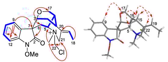 The molecular formula of compound 2 was suggested as C22H26N2O3Cl by the quasi-molecular ion at m/z 401.1625 [M]+ (calcd for 401.1626). In the 13C and 1H NMR spectra of compound 2 (Table 1), a total of two methyl groups, five methylenes, eight methines, and seven quaternary carbon resonances were discovered. Such spectral data could be specifically assigned to sarpagine-type alkaloid N(b)-methylaknammidine [18], except the N4-methyl in N(b)-methylaknammidine was replaced by a CH2 (δC 67.8, C-22) moiety in compound 2. Given the remaining chlorine group in the HR-ESI-MS analysis, the other end residue of C-22 was speculated to connect with chlorine. In addition, the HMBC correlations from δH 5.52 (H-22) to δC 61.6 (C-3) and δC 60.2 (C-21) further supported the previous reasoning and established the planar structure of compound 2 (Figure 4).