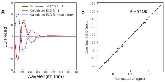 Quantum chemical calculations of compound 1. (A) Calculated and experimental ECD spectra of compound 1; (B) Regression analysis of experimental versus calculated 13C NMR chemical shifts of compound 1.