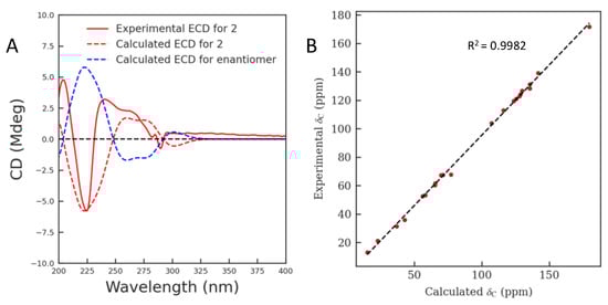 Quantum chemical calculations of compound 2. (A) Calculated and experimental ECD spectra of compound 2; (B) Regression analysis of experimental versus calculated 13C NMR chemical shifts of compound 2.