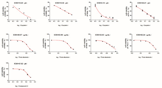 The IC50 values of the total alkaloids, compound 2, and positive control drug cisplatin.