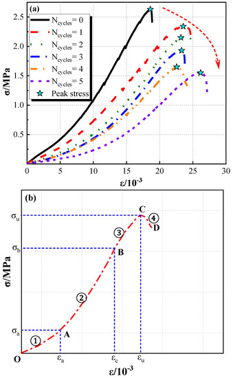 A series of uniaxial compression experiments were carried out to investigate the stress–strain curves of various specimens with different wet–dry cycles. The loading rate is 1 mm/min, and the results are shown in Figure 3.