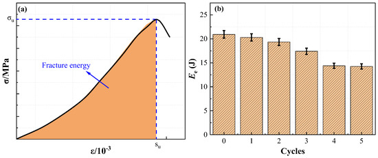 The fracture energy (Ee) was employed to evaluate the energy absorption ability of specimens at different wet–dry cycles. It can be calculated by integrating the area of nominal stress–strain curves as per Equation (2), ranging from 0 to its peak strain (su). The simplified illustration and fracture energy of specimens at different wet–dry cycles are displayed in Figure 5.
