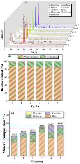 XRD results of specimens at different wet–dry cycles: (a) XRD; (b) minerals; and (c) primary clay minerals.