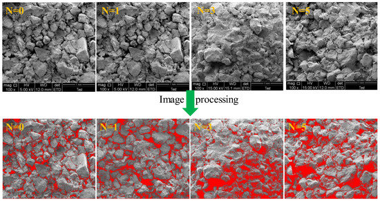 A pixel-based image processing algorithm base on the SEM results was employed to compare and analyze the porosity and distribution of specimens at different wet–dry cycles [16,24]. In order to provide more analysis objects and meet the statistical requirements, the SEM results with a magnification of 100 times were selected. In addition, each group of six SEM images was chosen to reduce errors. The image processing of specimens at different wet–dry cycles was given in Figure 8, wherein the gray and red contrast in the images showed the density distribution of the voids. With the increase of wet–dry cycles, the red area gradually increased, indicating that the defect area and porosity of samples increased. It should be mentioned that the defect area started to connect and became huge pores when the number of wet–dry cycles exceeded three. The porosity and distribution of samples after different wet–dry cycles are illustrated in Figure 9.
