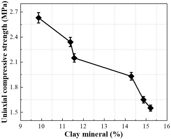 The correlation between porosity and clay mineral content of Pisha sandstone at different wet–dry cycles is depicted in Figure 11. With the increase of clay mineral content, the porosity of specimens gradually increased. When the clay mineral content increased from 9.86% to 15.21%, the porosity of samples grew from 10.64% to 29.40%, rising by 176.32%. This phenomenon is attributed to the decomposition of primary minerals into clay minerals during the wet–dry cycles, which increases the cracks and pores inside the specimens. Figure 12 illustrates the correlation between clay mineral content and the uniaxial compressive strength of Pisha sandstone at different wet–dry cycles. The uniaxial compressive strength of specimens exhibited a negative correlation with the clay mineral content. When the clay mineral content increased from 9.86% to 15.21%, the uniaxial compressive strength of samples decreased from 2.63 MPa to 1.55 MPa, a decrease of 41.06%. This is because the decomposition of primary minerals into clay minerals increases the internal defects of specimens, leading to a decrease in macroscopic mechanical properties.