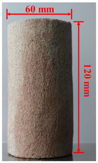 According to the Standard for Geotechnical Test Methods (GB/T 50123-2019) [29], 36 cylinders with a diameter of 60 mm and a height of 120 mm (see Figure 13) were prepared and divided into six groups on average. The average values of the physical properties of the initial Pisha sandstone specimens are listed in Table 3.