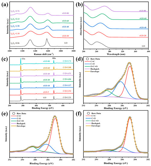 The number of functional groups at the base and edge of rGO varies with the different weight ratios of GO and 1,4-diiodobutane. The reduction degree of GO was measured using laser confocal micro-Raman spectroscopy, ultraviolet-visible, and XPS. Raman spectroscopy can quickly and effectively characterize the structure of carbon materials, and can infer ordered and disordered carbon crystal structures. Figure 1a shows the Raman spectra of GO and rGO treated with different proportions of reducing agents. It can be seen from the figure that rGO has two strong absorption peaks at 1320 cm−1 and 1580 cm−1, respectively. Peak D is the acoustic vibration peak induced by disordered carbon. The intensity of the peak can be used to indicate the disorder and structural imperfection of carbon materials. The G peak is caused by the first-order Raman scattering of the E2g phonon of the sp2 carbon atom, and the intensity of the peak can be used to indicate the integrity and order of the carbon material. Peak D and Peak G, respectively, represent the number of sp3 and sp2 hybrid carbon atoms, and the intensity ratio (ID/IG) can be used to indicate the disorder degree of the carbon material [37]. After treatment with different proportions of the reducing agent (1,4-diiodobutane: GO = 0, 20, 40, 60, 80), the intensity ratios of rGO are 0.86, 1.18, 1.50, 2.13, 3.76, respectively; that is, as the amount of reducing agent increases, the ID/IG ratio of the obtained graphene gradually increases. Theoretically, when the GO is reduced, the functional groups on the graphite flakes will be removed, the order of the sp2 carbon network structure will increase, the sp2 area will become larger, and ID/IG will decrease. The possible reason for this change trend, which is contrary to theoretical predictions, is that after GO is reduced, a large number of sp3 hybrid carbon atoms will re-form new sp2 hybrid regions after deoxidation, and the re-formed sp2 regions are greater than the GO [38,39].