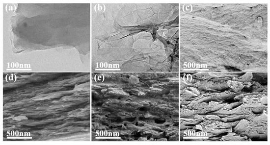 Figure 3a showed the TEM image of GO. There were wrinkles around the edges of the GO layers, revealing that there were extremely few GO layers. In addition, the TEM image showed that the surface of GO was flat, smooth, and transparent. A TEM image of rGO is depicted in Figure 3b. It can be seen from the figure that there are parts of the graphene sheets that overlap, in undulating folds like waves, with a semi-transparent structure that resembled yarn. This was because the oxygen-containing graphene functional groups were reduced, resulting in intermolecular forces between the graphene layers. However, it is quite easy to reunite the slices, and the overlap between them is readily apparent. The cross-sections of the PI film and the composite films were examined by scanning electron microscopy in order to better understand the interfacial interactions between rGO with varying reduction extents and the PI matrix and to evaluate their dispersion and compatibility in a polymer matrix. The fracture surface of pure PI was flat and smooth compared to the surrounding matrix, indicating characteristics typical of brittle fractures (Figure 3c). In Figure 3d–f, it can be seen that compared with the PI film, the fracture surfaces of the composite films were relatively rough, which indicated that GO and PI had good interfacial interaction and GO was well dispersed in the matrix. Compared with GO/PI, the cavities of rGO/PI composite films tend to be more prominent, resulting from the pulling out of rGO.