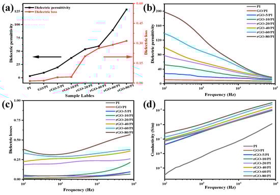 (a)Trend diagrams of dielectric permittivity and dielectric loss for pure PI, GO/PI, and rGO/PI composite films at 1000 Hz: frequency dependency, (b) dielectric permittivity, (c) dielectric loss, (d) conductivity.