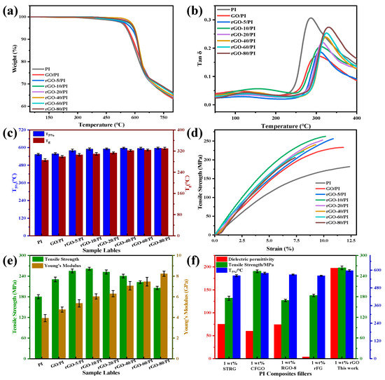 (a) TGA curves, (b) variation in the loss tangent of the dynamic mechanical properties with temperature, (c) the T5% and Tg, (d) typical stress–strain curves, (e) the tensile strength and the Young’s modulus for pure PI, GO/PI and rGO/PI composite films, (f) the dielectric permittivity, mechanical properties, and thermal properties of various fillers for PI composite films.