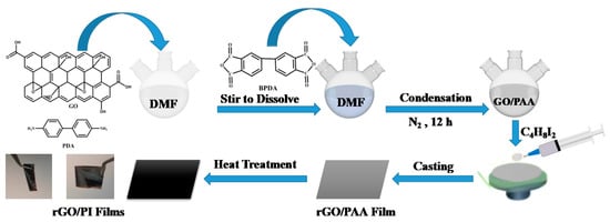 Polymerization in situ was used to prepare all composite films in this study (Figure 6). The following is an example of the preparation process for the rGO/PI composite film: GO dispersion (1.0 wt.%, 6.00 g), p-PDA (1.62 g, 15.0 mmol) and 18 mL DMF were added to a three-necked flask and stirred until completely dissolved. Then, s-BPDA (4.41 g, 15.0 mmol) was added and stirred continuously for 10 h to form a uniform GO/PAA (polyamide acid) solution. Subsequently, 1,4-diiodobutane (0.30 g) was added to the GO/PAA solution and stirred for 2 h. After the above solution was completely dissolved, it was applied to the smooth surface of the glass and heated and imidized, according to the following gradient: 100 °C, 4 h; 150 °C, 2 h; 200 °C, 1 h; 300 °C, 1 h; 350 °C, 1 h; and 420 °C, 1 h. After imidization, the film (rGO-5/PI) was immersed in hot water at 85 °C for 2 h to peel it from the glass substrate. The ratio of 1,4-diiodobutane in GO was adjusted from 5 to 10, 20, 40, 60, and 80 in order to achieve composite films of graphene/polyimide with varying degrees of reduction. The corresponding rGO/PI composites were denoted as rGO-5/PI, rGO-10/PI, rGO-20/PI, rGO-40, rGO-60/PI, and rGO-80/PI, respectively. The above steps could also be used to prepare a GO/PI film and a PI film, without using a reducing agent.