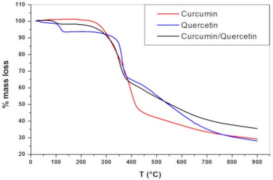 Thermo-gravimetric analyses (TGA) revealed that between 94 and 137 °C, quercetin had a first mass loss (around 6.5%), which was likely caused by the sample’s loss of water. This finding demonstrates that, while being lipophilic, quercetin exhibits a degree of crystal lattice hydration in the solid state. The second stage of mass loss had a mass loss of 27.3% and ran from 240 °C to 385 °C. A third mass loss with a loss of 38% happened in the 386–900 °C range. At 900 °C, the remaining mass was 28.2%. Three breakdown phases were visible in the TGA profile of the binary physical mixture of curcumin and quercetin (1:1). Due to the inclusion of quercetin hydrates in the combination, the initial mass loss was the release of water molecules; this mass loss occurred between 72 and 127 °C and had a lower percentage than that of pure quercetin. The second and third mass losses are in line with the thermal breakdown of the compounds (curcumin and quercetin) at the highest temperatures, which has been observed for pure compounds as well (Figure 2) [28].