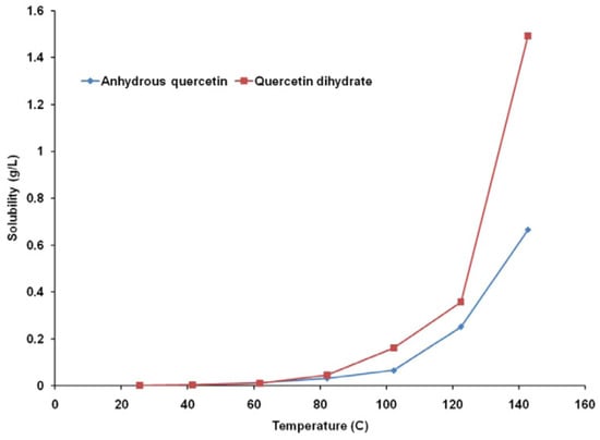 Using a continuous flow type apparatus, the aqueous solubility of 3,3′,4′,5,7-pentahydroxyflavone (quercetin) and its dihydrate was determined between 25 and 140 °C. The subcritical water flows at 0.1, 0.2, and 0.5 mL/min was studied to check it effect on thermal degradation and quercetin solubility at temperatures above 100 °C. Up to 80 °C, quercetin dihydrate’s water solubility was comparable to that of anhydrous quercetin. The aqueous solubility of quercetin dihydrate was 1.5–2.5 times greater than that of anhydrous quercetin at temperatures more than or equal to 100 °C as represented in Figure 3 [27].