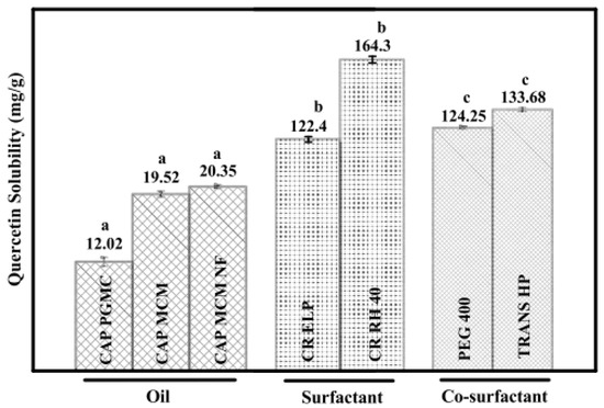 Solubility of quercetin in oils, surfactants, and cosurfactants. Different lower-case letters between the groups (oil, surfactant, and co-surfactant) are significantly different from each other (p < 0.05, n = 3, error bars show standard deviation) [46].