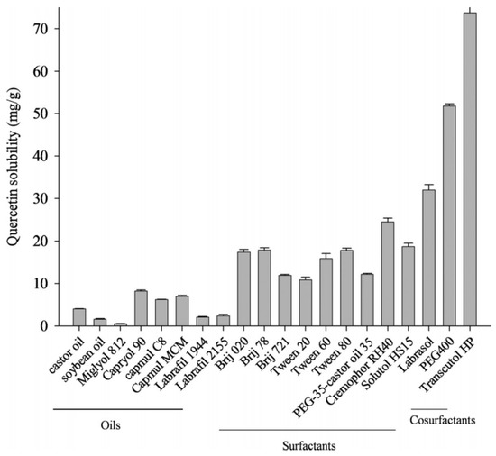 Tran et al. also studied the solubility of quercetin in different solutions and the quantification of quercetin content using UV–Vis spectroscopy. Different oils, surfactants, and cosurfactants were tested for quercetin solubility (Figure 10). The solubility of quercetin in castor oil, CapmulR MCM, and CapryolR was higher than in labrafil, miglyol 812, and soybean oil. Their effectiveness determined the choice of surfactant in emulsifying rather than by their capacity to solubilize quercetin [44]. Similarly, Silva et al. also studied the concentration of quercetin in the oil-water nanoemulsion using a UV–Vis spectrophotometer [51].