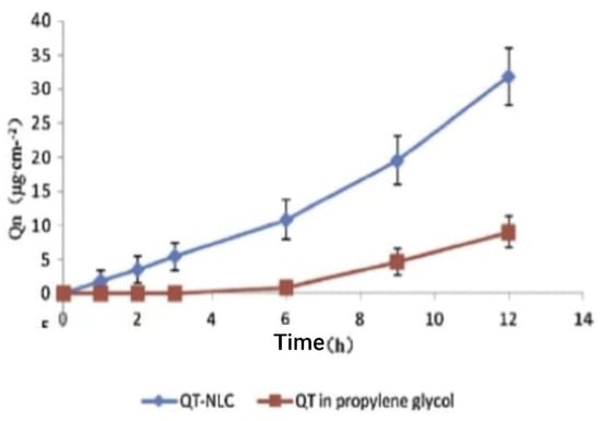 Profiles of QT permeation through excised rat skins from QT propylene glycol solution and QT-NLCs [50].