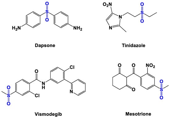 The oxidation products of organic sulfides (thioethers)–sulfones are particularly attractive. Sulfonyl-containing intermediates are widely used in the synthesis of natural and other biologically active substances (drugs, agrochemicals) because of their availability, versatility, easy chemical modification, high reactivity, and the possibility of an easy removal at a desired stage [20,21,22,23]. The sulfonyl group does not have its own asymmetry, but due to its unique bulk and electronic properties, it is able to exercise regio- and stereocontrol in reactions. Among sulfones, highly effective insect repellents, herbicides for a number of crops, solvents, polymers, and pharmaceuticals were found. Sulfonyl-containing compounds also exhibit significant antimicrobial, antifungal, antimalarial, anti-inflammatory, and anti-cancer activity, etc. [1,2,3,4,5,22,24,25,26,27]. The several drugs possessing the SO2 group are used to treat leprosy, dermatitis herpetiformis, and tuberculosis. For example, a diarylsulfone derivative known as Dapsone is used in the treatment of infectious diseases (leprosy and malaria) and skin and non-communicable inflammatory diseases, and it is included in the WHO Model Lists of Essential Medicines [4,28,29] (Figure 1). Another bioactive sulfonyl-containing compound, Tinidazole, is an antimicrobial and antiprotozoal agent. This antibiotic is a prodrug that was approved by the FDA in 2004 [1,30]. Vismodegib (Erivedge®) is an effective and generally well-tolerated medication for patients with basal cell carcinoma (BCC) [1,31], while mesotrione is a selective herbicide for the control of certain weeds [2].