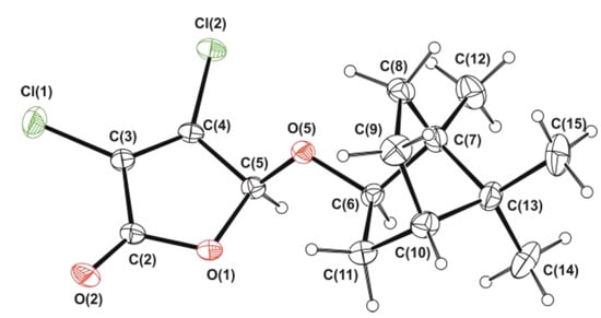 In the initial step, 3,4-dihalo-2(5H)-furanones 3–6 were obtained from acid-catalyzed reactions of commercially available mucochloric 1 and mucobromic 2 acids with l-menthol and l-borneol [56,60,63,64,65,66] (Scheme 1). Compounds 3–6 were firstly synthesized as 1:1 mixtures of diastereomers that differ in the configuration of the C-5 atom of the γ-lactone ring. The partial recrystallization from hexane allowed for the isolating of pure less soluble (S)-stereoisomers 3a–6a. In addition to the previously described crystal structure of 5-menthyloxy-2(5H)-furanone 3a [67], we obtained X-ray diffraction data for the crystalline sample of stereoisomerically pure 5-bornyloxy-2(5H)-furanone 5a and established the (S)-configuration of the chiral center C-5 (Figure 2).