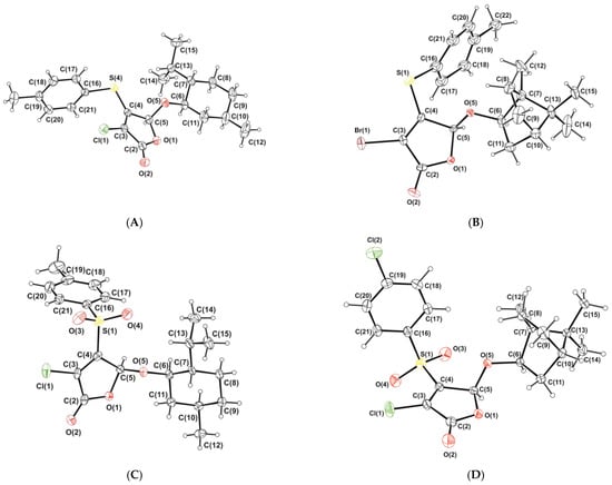 The molecular structures of thioethers 7, 8, 11, 16, and 18 and sulfones 19, 20, 24, 26–28, and 30 were characterized by single crystal X-ray diffraction (Figure 3). The structures of all compounds were solved in the chiral space groups, which are characteristic of crystals of enantiopure compounds: monoclinic P21 (compounds 8, 11, and 18), trigonal P32 (compound 16), and orthorhombic P212121 (compounds 7, 19, 20, 24, 26–28, and 30). The absolute configuration of chiral centers has been determined from the anomalous scattering of heavy atoms (sulfur and halogens). In all of the studied molecules, both the 5-menthyloxy- and 5-bornyloxy-2(5H)-furanones, the C-5 carbon atom of the lactone ring has an (S)-configuration.