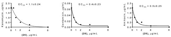 Antibacterial activity of 26 when combined with aminoglycoside antibiotics against S. aureus. The EC50 of 26 was calculated as the concentration of the antimicrobial agent that reduced two-fold MIC of an antibiotic and presented in µg/mL; mean ± SD from five calculations is shown.