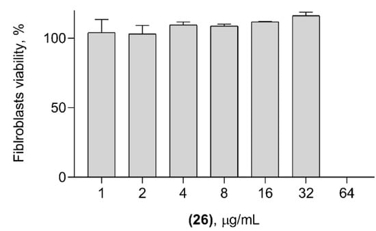 The cytotoxic concentration of 26 on human cells in order to assess their selectivity against bacteria was further determined in the MTT assay. The sulfone 26 at a concentration of 32 μg/mL remains completely safe for human fibroblasts, while the next dilution at 64 μg/mL significantly inhibits the growth of the cells (Figure 5). The obtained cytotoxicity data are relatively similar to the data obtained earlier for the compound 19 [60], suggesting that the compound is suitable for the topical application, while systemic use could be problematic.