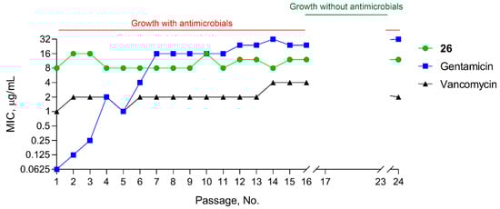 We previously showed a low risk of the resistance development to 2(5H)-furanone derivative by B. cereus [56], suggesting these compounds are an attractive alternative approach for the treatment of resistant bacterial strains. Therefore, we next aimed to investigate whether S. aureus can develop resistance to 26 compared to gentamicin and vancomycin. After 16 passages of growth in the presence of antimicrobial agents at sublethal concentrations, S. aureus did not significantly change susceptibility to compound 26 (Figure 6). Similarly, S. aureus did not develop a resistance to vancomycin with a minor increase of MIC from 1 to 2 µg/mL. Surprisingly, the MIC of gentamicin against S. aureus increased by more than 100-fold by the end of the experiment since a significant increase in MIC values was observed during the first seven passages from 0.06 to 16 µg/mL.