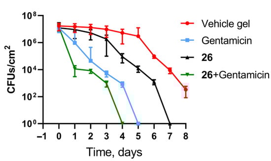 Owing to a low risk of resistance development and the small concentrations of 26 required for increasing the efficacy of gentamicin, we were interested in whether 26 can improve the antimicrobial activity of gentamicin on an in vivo model of an infected skin wound in a rat as described in [77]. The wounds were formed in the dorsal region of rats and infected with liquid S. aureus culture for one day. The 24 h application of bacterial suspension resulted in 107 CFUs/cm2, suggesting the infection development. Every day, the wounds were treated with a gel containing a combination of 26 and gentamicin. The solely vehicle gel or gels containing either 26 or gentamicin alone served as controls. In addition, the wounds were washed with cotton swabs to further analyze remaining S. aureus colony forming units (CFU). The fastest bacterial decontamination of the rat wounds was observed after four days of treatment with gentamicin combined with 26 (Figure 7). A treatment with either gentamicin or 26 alone cleared the wound from bacteria after five and seven days, respectively. A vehicle gel decreased bacterial number in the wound to a much lesser extent.