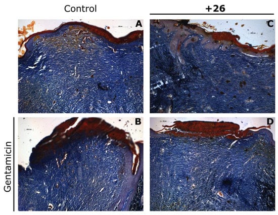 Histological analysis of rat skin areas subjected to infection and treated for 15 days with vehicle gel (A), gentamicin (B), 26 (C), and 26 combined with gentamicin (D). Scale bar is 100 µm. Samples were fixed in 10% formalin and collagen fibers were stained according to Mallory’s protocol.