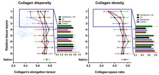The collagen dispersity and collagen density in rat skin areas subjected to infection and treated for 15 days with 26 combined with gentamicin, solely gentamicin, solely 26, or vehicle gel as indicated. Parameters corresponding to tissue unaffected in surgery are marked as Native. Relative tissue layers correspond to horizontal layers of the grid used for images analysis where the first layer corresponds to the top of the recovered tissue. Mean ± SD from five calculations is shown. Asterisks show significant difference with wounds treated with vehicle gel.