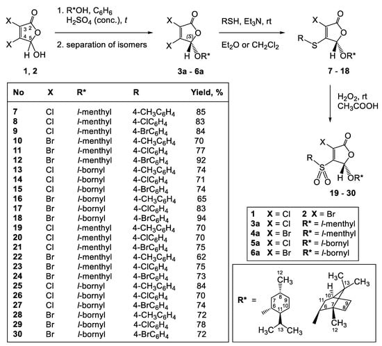 5(S)-3,4-Dichloro-5-[(1R,2S,5R)-2-isopropyl-5-methylcyclohexyloxy]-2(5H)-furanone (3a) [60,63], 5(S)-3,4-dibromo-5-[(1R,2S,5R)-2-isopropyl-5-methylcyclohexyloxy]-2(5H)-furanone (4a) [64], 5(S)-3,4-dichloro-5-[(1S,2R,4S)-1,7,7-trimethylbicyclo[2.2.1]heptan-2-yloxy]-2(5H)-furanone (5a) [56,65], 5(S)-3,4-dibromo-5-[(1S,2R,4S)-1,7,7-trimethylbicyclo[2.2.1]heptan-2-yloxy]-2(5H)-furanone (6a) [66], 5(S)-3-chloro-5-[(1R,2S,5R)-2-isopropyl-5-methylcyclohexyloxy]-4-[4-methylphenylsulfanyl]-2(5H)-furanone (7) [60], 5(S)-3-chloro-4-[(4-chlorophenyl)sulfanyl]-5-[(1S,2R,4S)-1,7,7-trimethylbicyclo[2.2.1]heptan-2-yloxy]-2(5H)-furanone (14) [85], 5(S)-3-chloro-5-[(1R,2S,5R)-2-isopropyl-5-methylcyclohexyloxy]-4-[4-methylphenylsulfonyl]-2(5H)-furanone (19) [60], and 5(S)-3-chloro-4-[(4-chlorophenyl)sulfonyl]-5-[(1S,2R,4S)-1,7,7-trimethylbicyclo[2.2.1]heptan-2-yloxy]-2(5H)-furanone (26) [85] were synthesized according to the known methods.