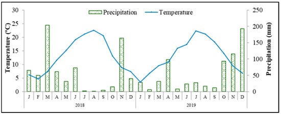 Average monthly temperature and precipitation conditions recorded during the experimental period in the weather station in Paradela, close to the experimental plot.