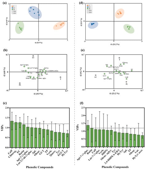 (a–c) OPLS-DA of olive fruit and (d–f) olive oil phenolic compounds, irrespective of the year. (a and d) Scores plot and (b and d) loadings plot of the first two factors of the OPLS-DA model built with the phenolic profile of the olive oil according to the soil treatment. (c,f) Phenolic compounds ranked by VIP scores. Caffeic acid (Caff), chlorogenic acid (Chlorog), rutin, luteolin-3,7-di-O-glucoside (Lut-3,7-di-O-gluc.), epicatechin (EC), apigenin-7-O-glucoside (Api-7-O-gluc), apigenin (Api), oleuropein (Oleur), gallocatechin (GCT), total phenols (TP), verbascoside (Verb.), quercetin-3,7-di-O-glucoside (Querc.), tyrosol (Tyr), epigallocatechin (EGCT), hydroxytyrosol (HyTyr), luteolin-7-O-glucuside (Lut-7-O-gluc.), 3,4-dihydroxyphenylglycol (DHPG), oleuropein aglycone (Oleur. aglyc.), dialdehydic forms of decarboxymethyl elenolic acid linked to hydroxytyrosol (3,4-DHPEA-EDA), luteolin (Lut.), hydroxytyrosol acetate (HyTyr acet.).