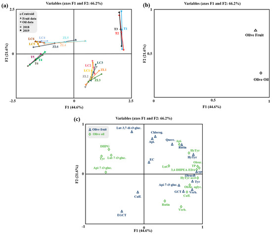 Multiple factorial analysis of phenolic compounds of olive fruit and olive oil. (a) Representation of olive samples and clouds; (b) representation of groups (tables) of variables; and (c) distribution of variables. Centroid (○); olive fruit data (∆); olive oil data (◊); centroids respective to samples from 2018 (○) and 2019 (●). Apigenin-7-O-glucoside (Api-7-O-gluc.), caffeic acid (Caff), luteolin-7-O-glucuside (Lut-7-O-gluc.), luteolin-3,7-di-O-glucoside (Lut-3,7-di-O-gluc), rutin, verbascoside (Verb.), 3,4-dihydroxyphenylglycol (DHPG), oleuropein aglycone (Oleur. aglyc.), tyrosol (Tyr), dialdehydic forms of decarboxymethyl elenolic acid linked to hydroxytyrosol (3,4-DHPEA-EDA), hydroxytyrosol (HyTyr), apigenin (Api.), total phenols (TP), oleuropein (Oleur.), luteolin (Lut.), hydroxytyrosol acetate (HyTyr acet.), epigallocatechin (ECGT), epicatechin (EC), gallocatechin (GCT), chlorogenic acid (Chlorog.), quercetin-3,7-di-O-glucoside (Querc.).