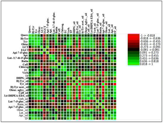 Heatmap of the correlation matrix between olive fruit phenolic compounds and olive oil phenolic compounds. Apigenin-7-O-glucoside (Api-7-O-gluc.), caffeic acid (Caff), luteolin-7-O-glucoside (Lut-7-O-gluc.), luteolin-3,7-di-O-glucoside (Lut-3,7-di-O-gluc), rutin, verbascoside (Verb.), 3,4-dihydroxyphenylglycol (DHPG), oleuropein aglycone (Oleur. aglyc.), tyrosol (Tyr), dialdehydic forms of decarboxymethyl elenolic acid linked to hydroxytyrosol (3,4-DHPEA-EDA), hydroxytyrosol (HyTyr), apigenin (Api.), total phenols (TP), oleuropein (Oleur.), luteolin (Lut.), hydroxytyrosol acetate (HyTyr acet.), epigallocatechin (ECGT), epicatechin (EC), gallocatechin (GCT), chlorogenic acid (Chlorog.), quercetin-3,7-di-O-glucoside (Querc.).