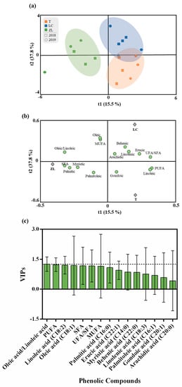 (a) Scores plot and (b) loadings plot of the first two factors of the OPLS-DA model built with the phenolic profile of the olive oil according to the soil treatment. (c) Phenolic compounds ranked by their VIP scores.