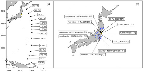 Tritium activity concentrations in various water samples after the FDNPP accident: (a) surface seawater values of the western North Pacific Ocean in winter 2012 according to [68], and (b) selected 2011 samples from Japan, given with the date of their collection and respective reference [64,67,69,70,71,72]. The yellow star represents the location of the FDNPP. The blue lines show the approximate areas of the significant wet deposition during the second half of March 2011 [2].