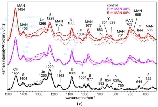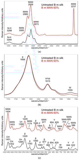 Raman spectra of B. mori silk fibroin fibers before and after grafting with MAN at the highest weight gain (i.e., 60%) in three different spectral ranges: (a) 3360–2180 cm−1, (b) 1730–1530 cm−1, and (c) 1500–530 cm−1. The spectra are normalized to the intensity of the Amide I band. The main bands assignable to β-sheet (β) or unordered (Un) conformation as well as to tyrosine (Y), phenylalanine (F), tryptophan (W), and the grafting agent (MAN) are indicated.