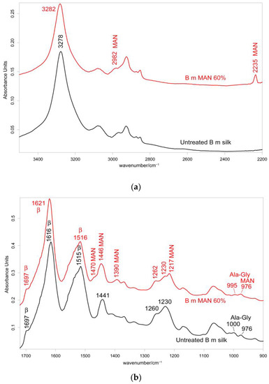 IR spectra recorded in the parallel orientation on B. mori silk fibroin fibers before and after grafting with MAN at the highest weight gain (i.e., 60%) in the 3500–2200 cm−1 (a) and 1720–900 cm−1 (b) spectral ranges. The spectra are normalized to the intensity of the Amide I band (1616–1621 cm−1). The main bands assigned to β-sheet (β) conformation, as well as to alanine-glycine domains (Ala-Gly), are indicated together with those having a contribution from MAN.