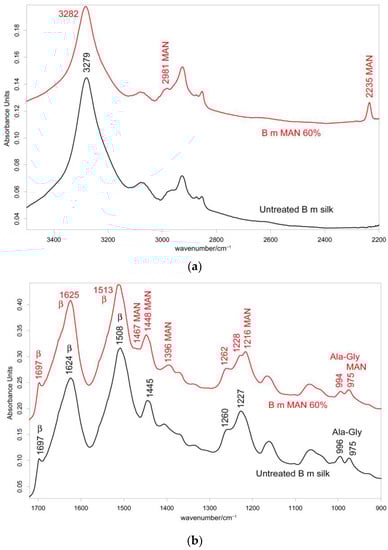 IR recorded in the perpendicular orientation on B. mori silk fibroin fibers before and after grafting with MAN at the highest weight gain (i.e., 60%) in the 3500–2200 cm−1 (a) and 1720–900 cm−1 (b) spectral ranges. The spectra are normalized to the intensity of the Amide I band (1624–1625 cm−1). The main bands assigned to β-sheet (β) conformation, as well as to alanine-glycine domains (Ala-Gly), are indicated together with those having a contribution from MAN.