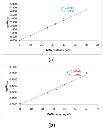 The Raman I2237/IAmide I and I703/IAmide I intensity ratios were the most suitable for spectroscopically monitoring grafting: the first band of each ratio is diagnostic of the grafting agent, while the Amide I band was chosen as an internal standard for silk, since it is not affected by the unreacted monomer (Figure 4). An almost perfect linear correlation was established between both intensity ratios and weight gain (I2237/IAmide I: R2 = 0.999; I703/IAmide I: R2 = 0.992). On the other hand, Wallasch et al. have used the Raman CN stretching vibration at about 2235 cm−1 to quantify MAN [36].